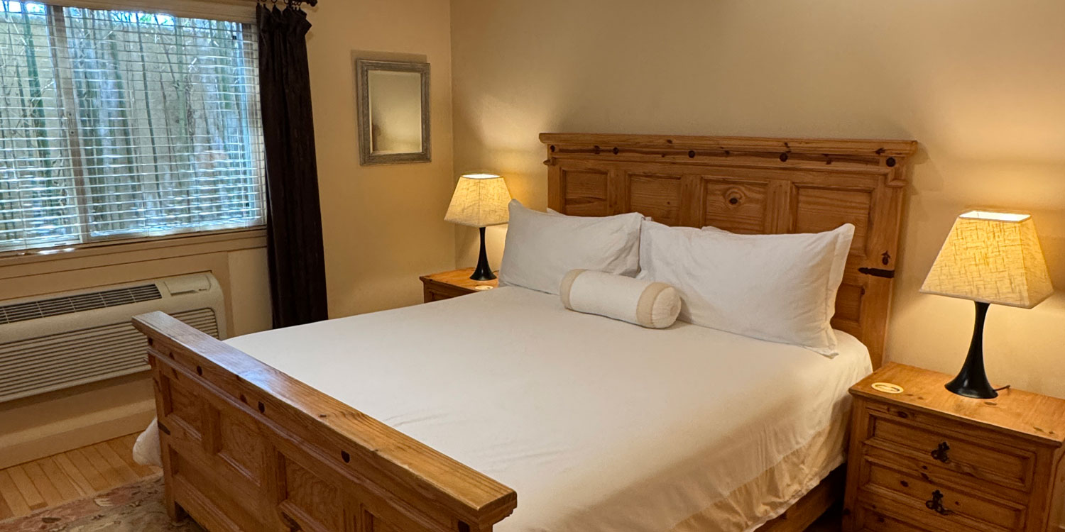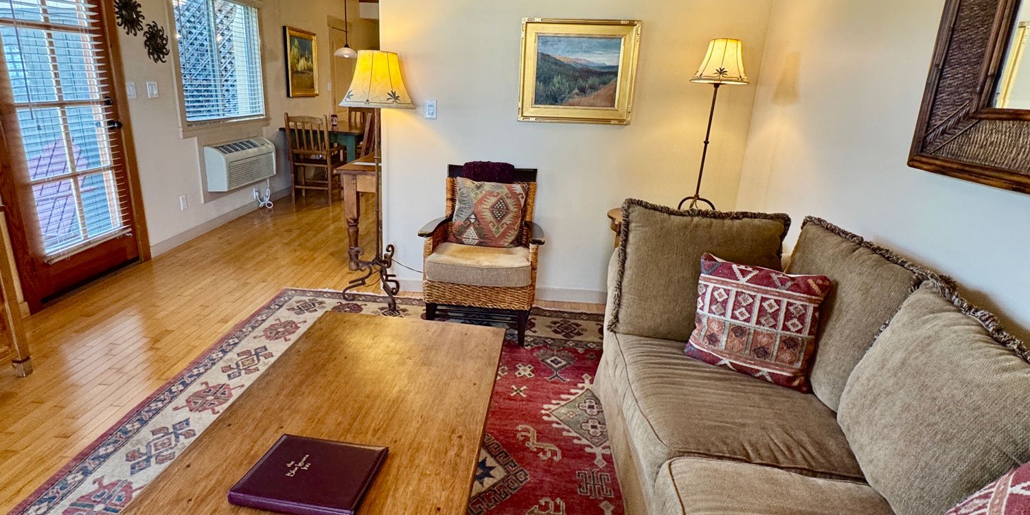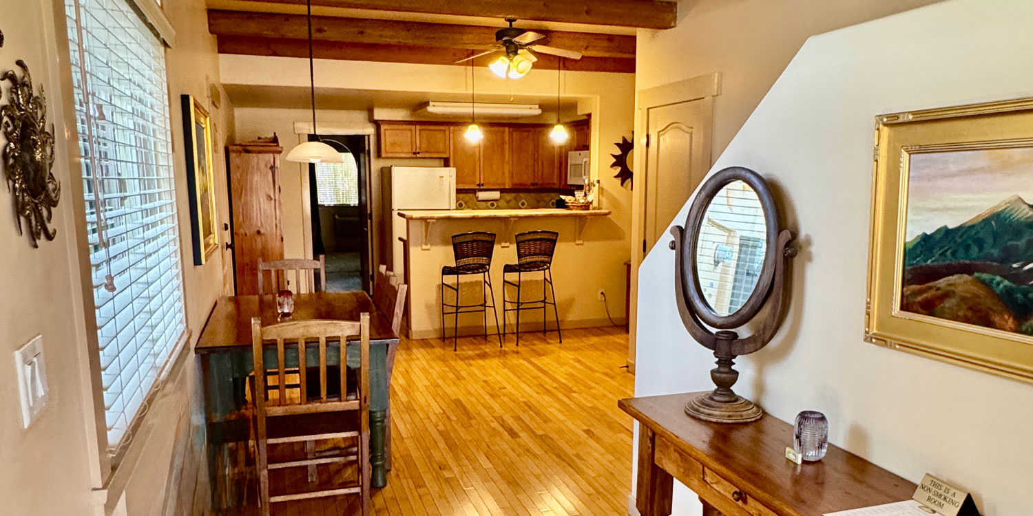 This lovely suite is spacious with hardwood floors throughout. The comfortable living room features overstuffed furniture and a gas-burning stove-type fireplace. The bedroom has a King bed and a private bath with a shower/tub combo. The kitchen is open to a spacious dining area. This is not a child or dog-friendly room.