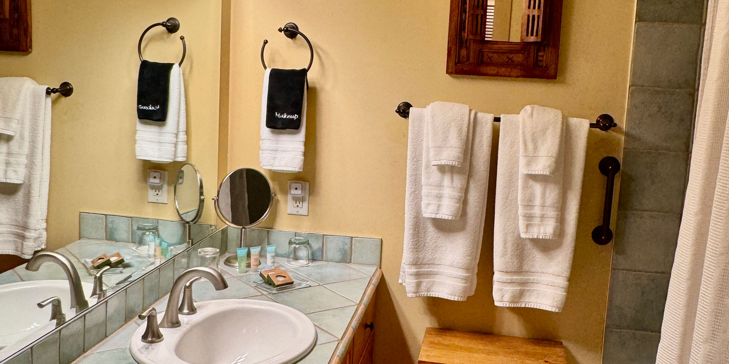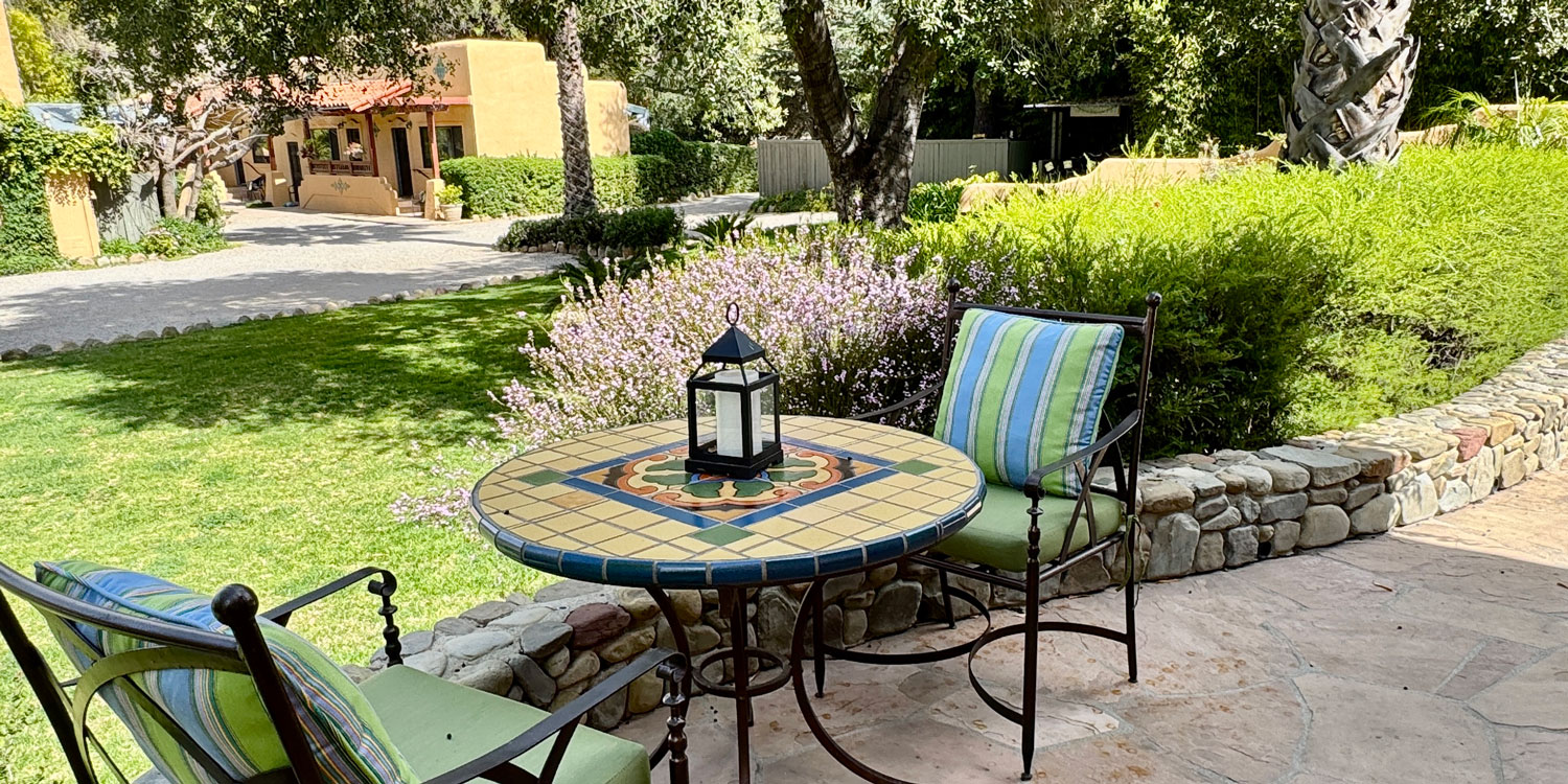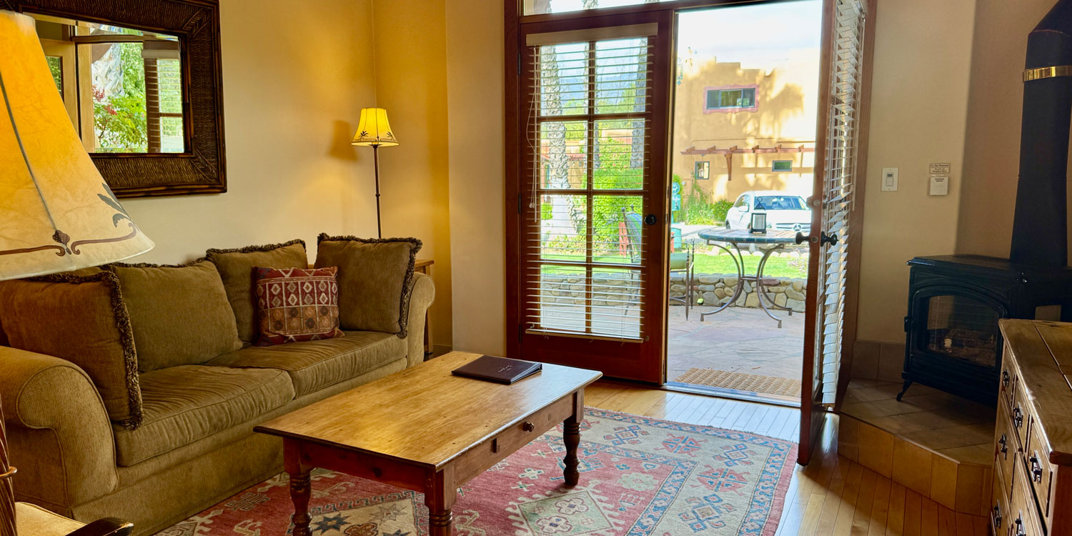 This lovely suite is spacious with hardwood floors throughout. The comfortable living room features overstuffed furniture and a gas-burning stove-type fireplace. The bedroom has a King bed and a private bath with a shower/tub combo. The kitchen is open to a spacious dining area. This is not a child or dog-friendly room.