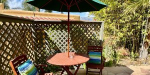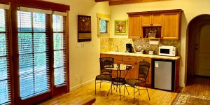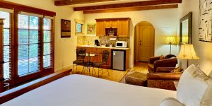 A Spacious room w/ a King bed, private bath w/ shower and coffee bar w/ mini-fridge. Front patio or courtyard area.